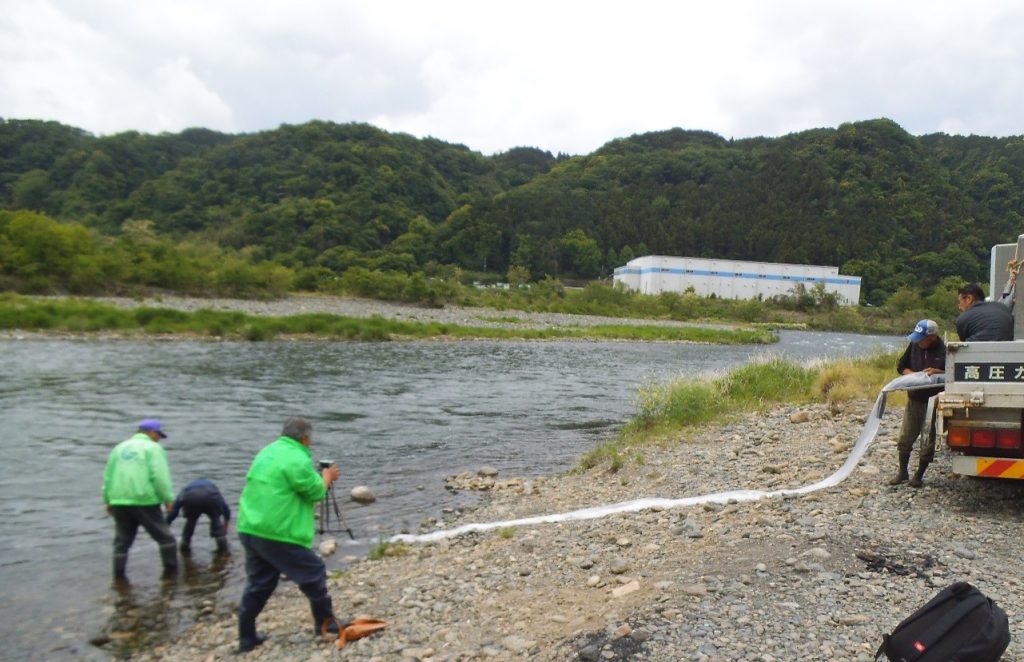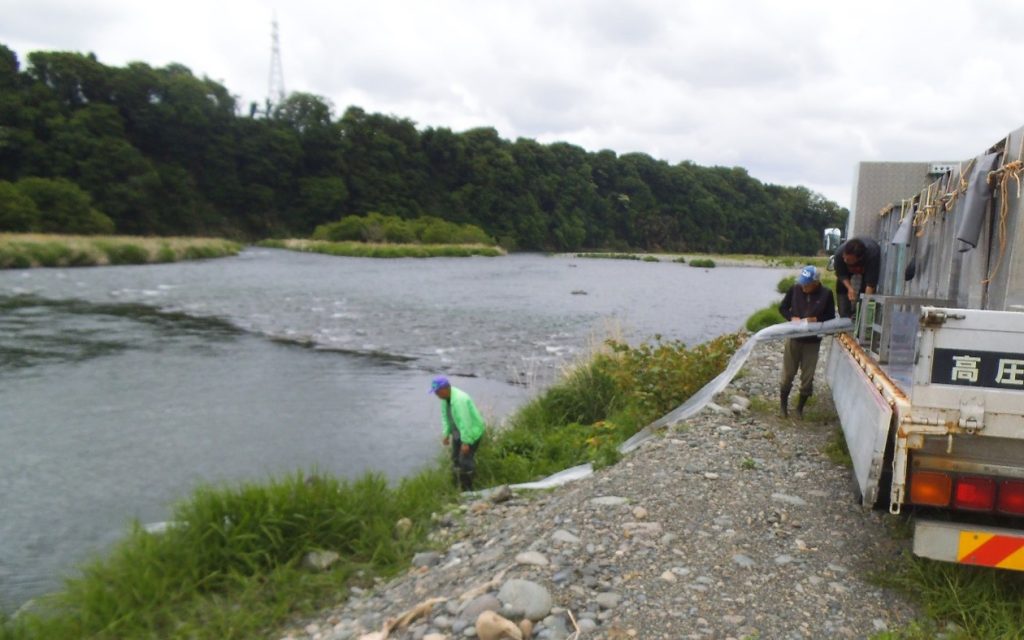 5月12日 大進館下流にあゆ125㎏放流しました。 1尾10㎝ 10g